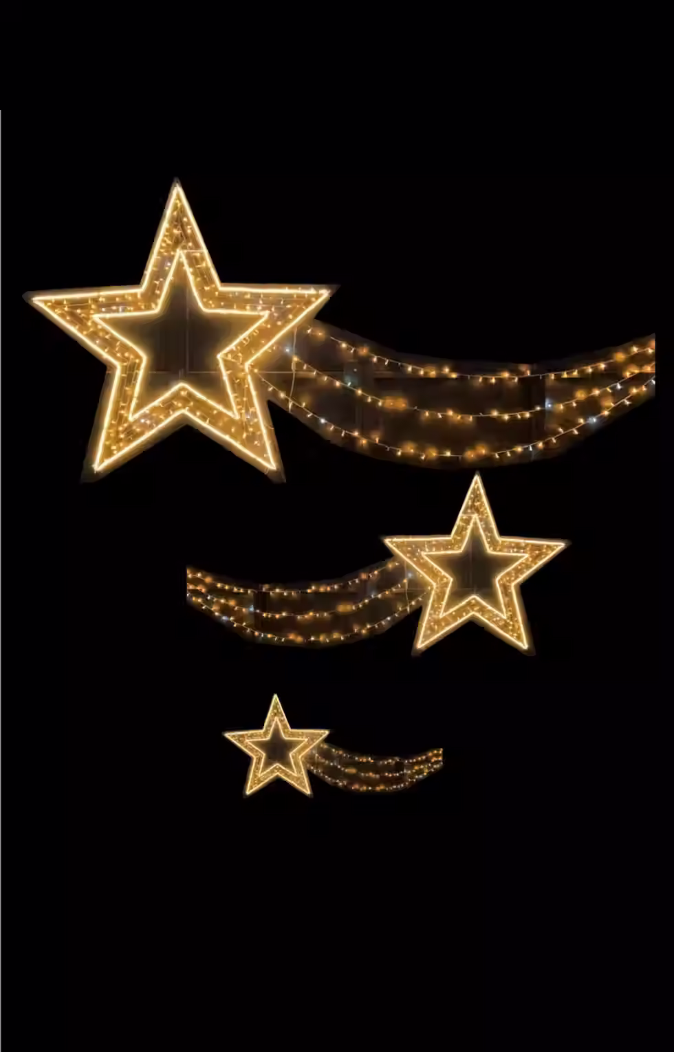 Tetti di luce sospesi che avvolgono le strade in cieli stellati artificiali.